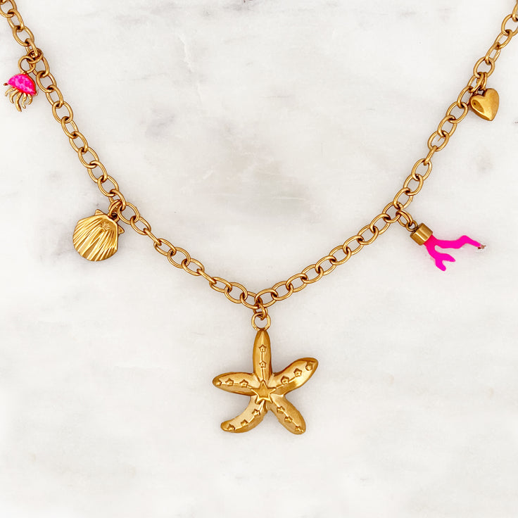 This delicate necklace features a charming collection of ocean-inspired charms: a starfish, pink coral, heart, pink jellyfish, and a tiny scallop shell. It's the perfect piece to carry a bit of the sea with you wherever you go.